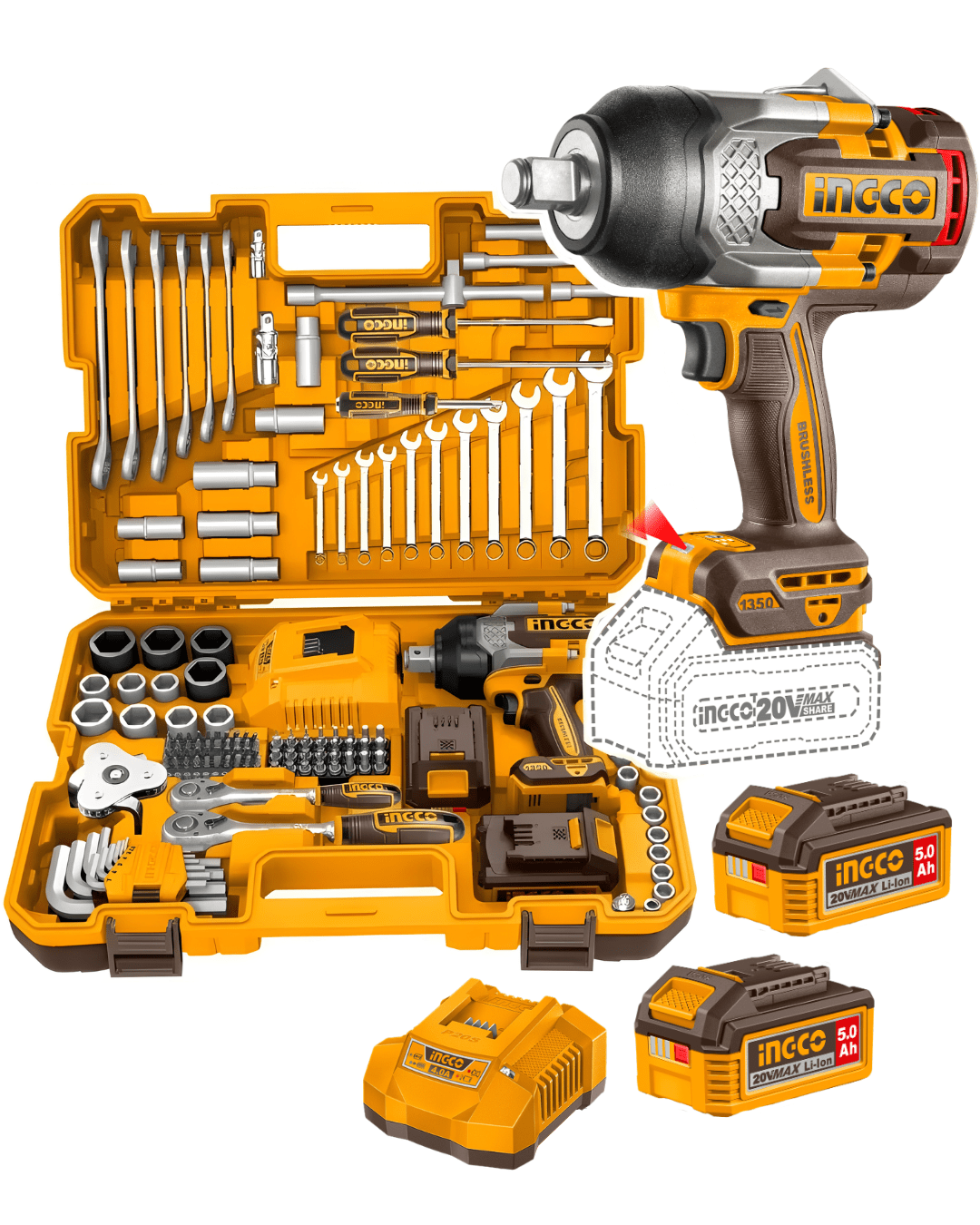 Combo 138 Herramientas + Llave de Impacto Inalámbrica 1350NM + 2 Baterías 5AH + Cargador Rápido INGCO HKTHP41383