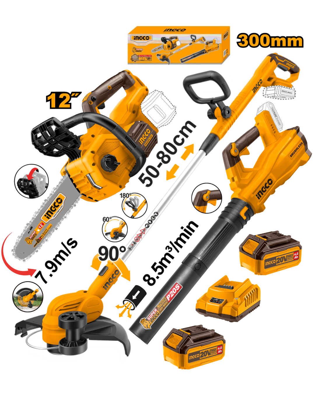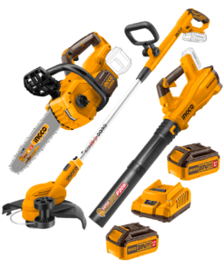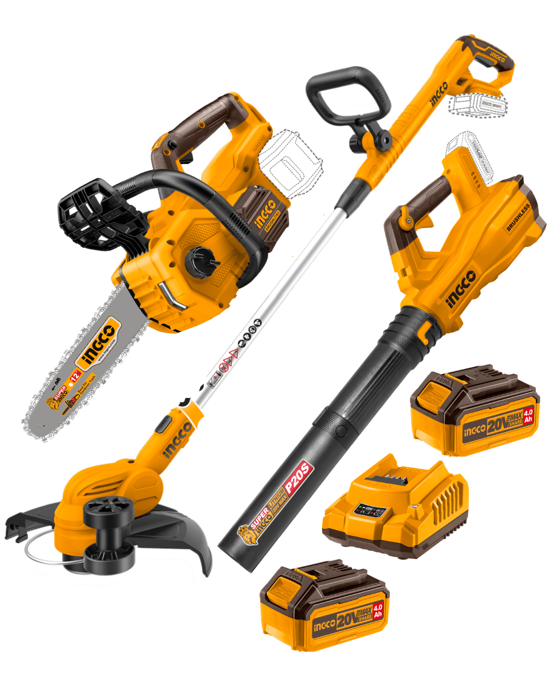 Este completo kit de herramientas de jardinería inalámbricas de 20V es ideal para mantener su jardín en óptimas condiciones sin las limitaciones de los cables. Incluye una motosierra de 12 pulgadas, una recortadora de césped y una sopladora, todas equipadas con motores sin escobillas para un rendimiento eficiente y duradero. Además, el conjunto viene con dos baterías de 4AH y un cargador rápido, asegurando un trabajo continuo y sin interrupciones.