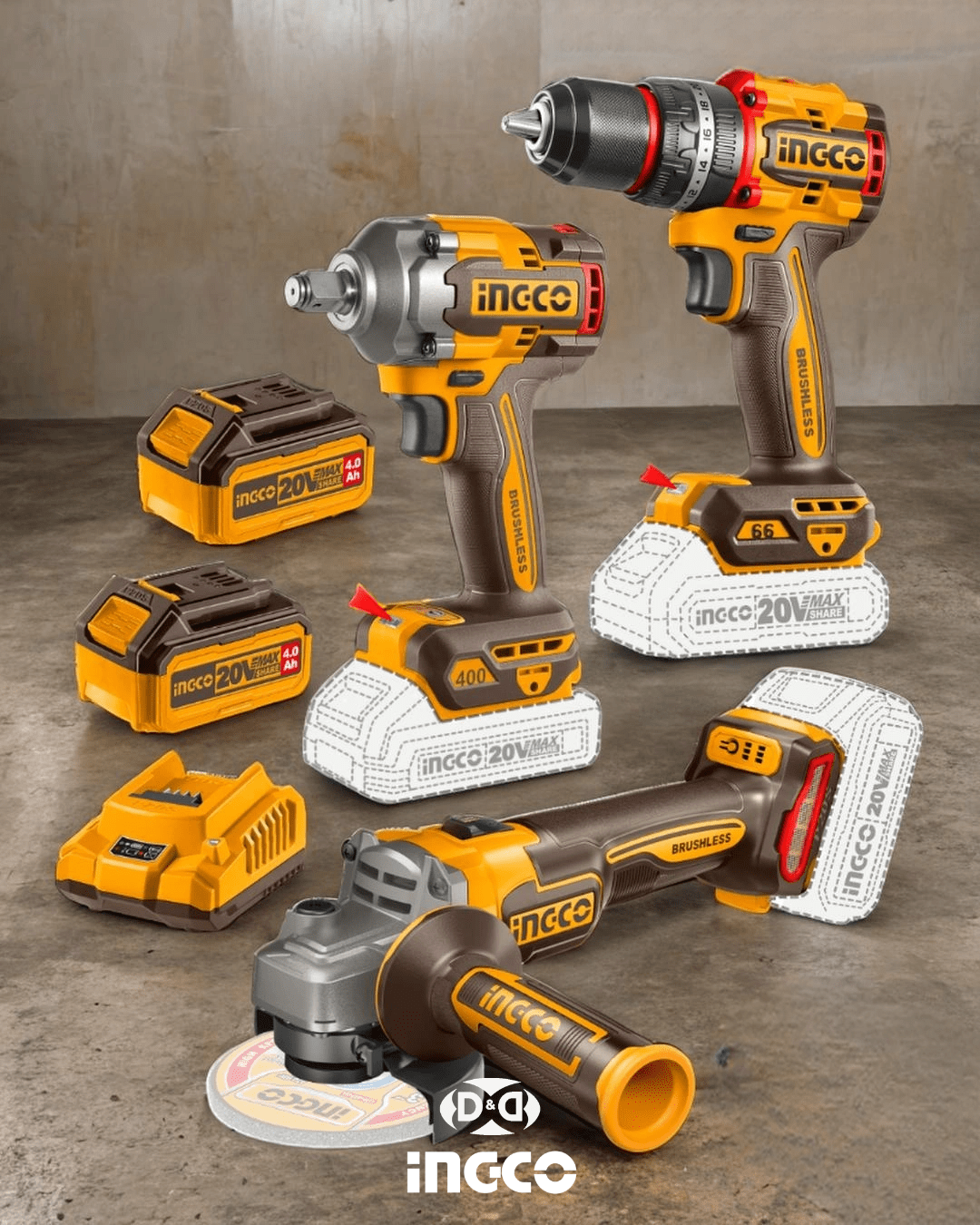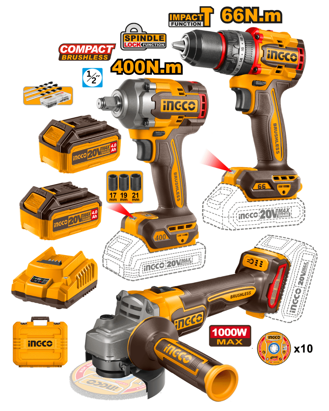 Kit profesional inalámbrico de 3 herramientas 20V con motor brushless (sin carbones), diseñado para ofrecer máxima potencia, autonomía y eficiencia en obra o taller. Incluye una amoladora angular de 115 mm, un taladro percutor de impacto de 66 NM, y una llave de impacto de 400 NM, todas con diseño ergonómico, luz LED integrada y alto rendimiento. El kit se completa con 2 baterías de 4AH, cargador rápido, maletín de transporte y accesorios para cubrir todo tipo de trabajos de perforación, atornillado, corte y apriete.