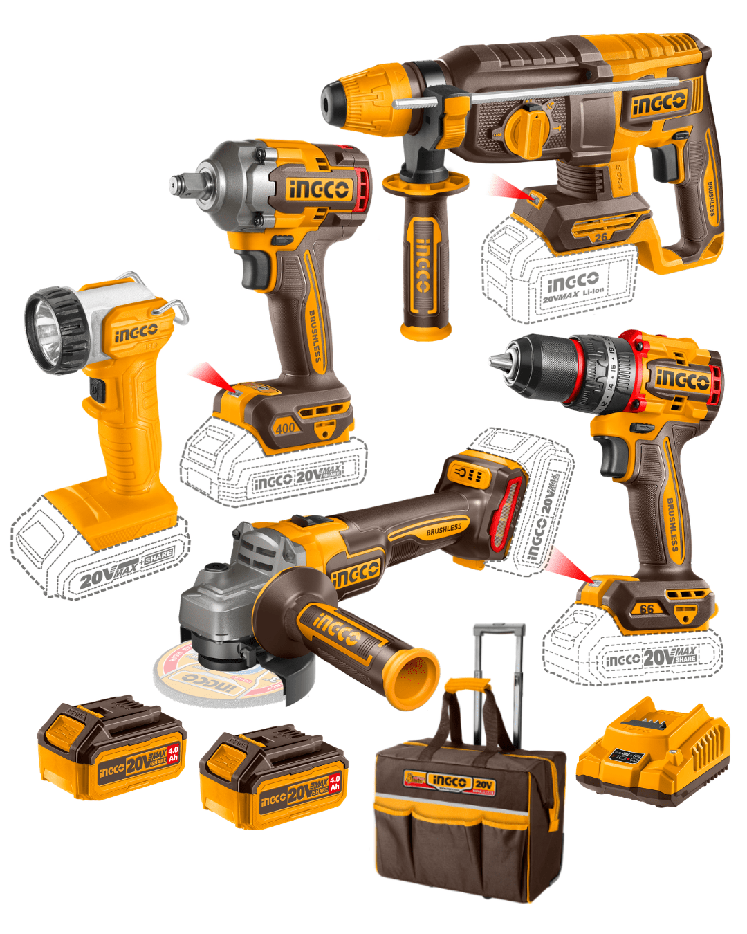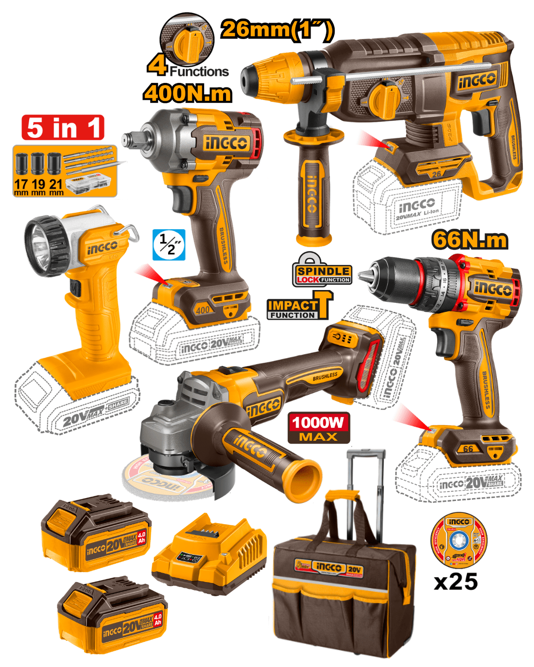 Completo kit de herramientas inalámbricas con motor brushless, diseñado para profesionales que buscan potencia, versatilidad y autonomía en todo tipo de trabajos. Incluye cinco herramientas esenciales para construcción, carpintería y mecánica, junto con una amplia variedad de accesorios, doble batería de alta capacidad y cargador rápido. Ideal para quienes necesitan rendimiento sin cables y máxima eficiencia en terreno.
