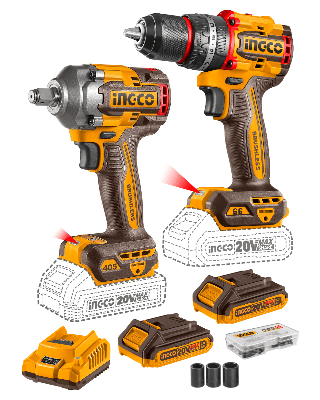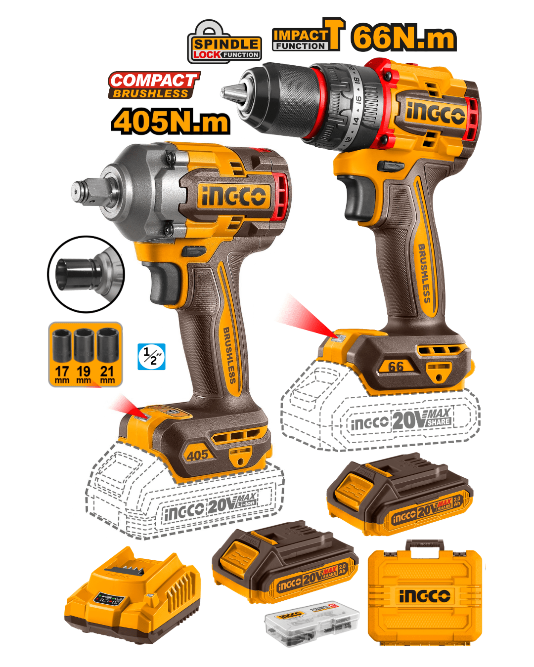 Combo 2 Herramientas Inalámbricas: Llave de Impacto 405NM + Taladro Atornillador Percutor de Impacto 66NM + 2 Baterías 2AH + Cargador INGCO CKLI20286