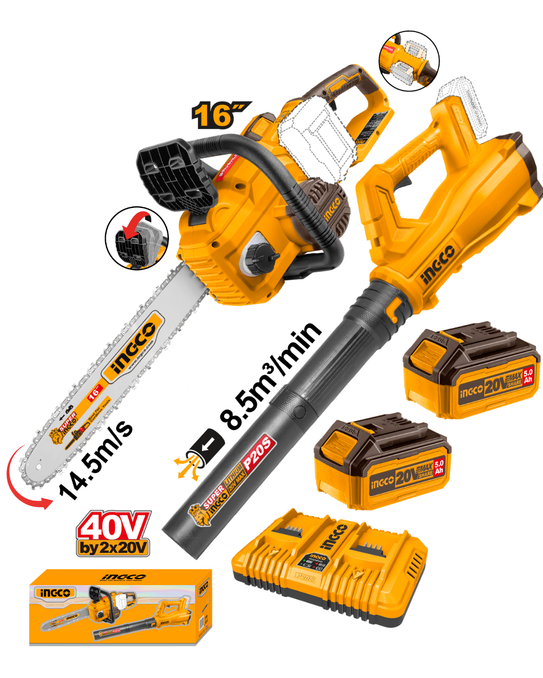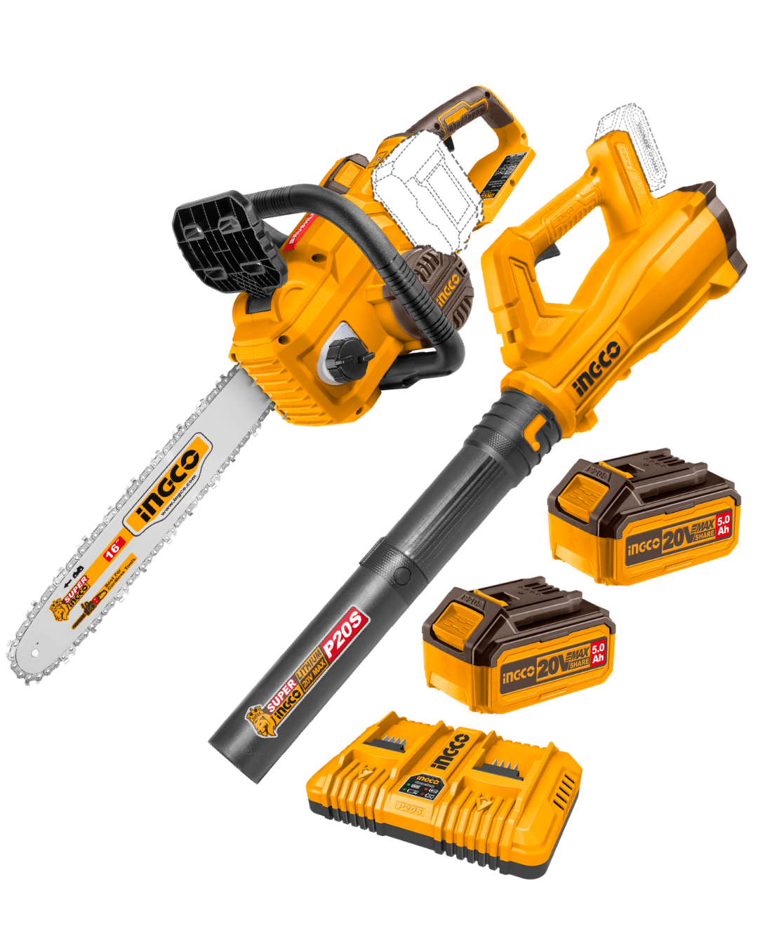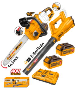 Este combo de herramientas inalámbricas es la solución ideal para quienes buscan potencia y movilidad en el mantenimiento de jardines, fincas y áreas verdes. La motosierra de 16″ ofrece un rendimiento eficiente con su motor sin carbones, velocidad de cadena de 14,5 m/s y lubricación automática, garantizando cortes rápidos y precisos. Además, la sopladora a batería proporciona una gran capacidad de flujo de aire y velocidad de hasta 115 km/h, facilitando la limpieza de hojas y residuos. Ambas herramientas funcionan con baterías de 20V y cuentan con un cargador de doble puerto para mayor comodidad.