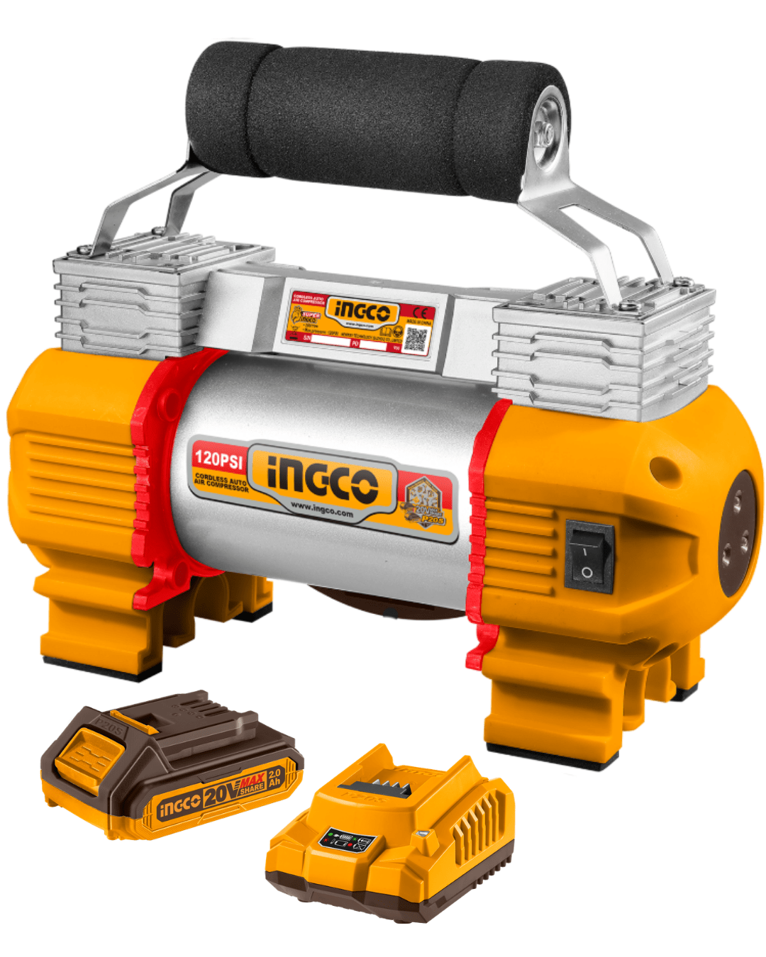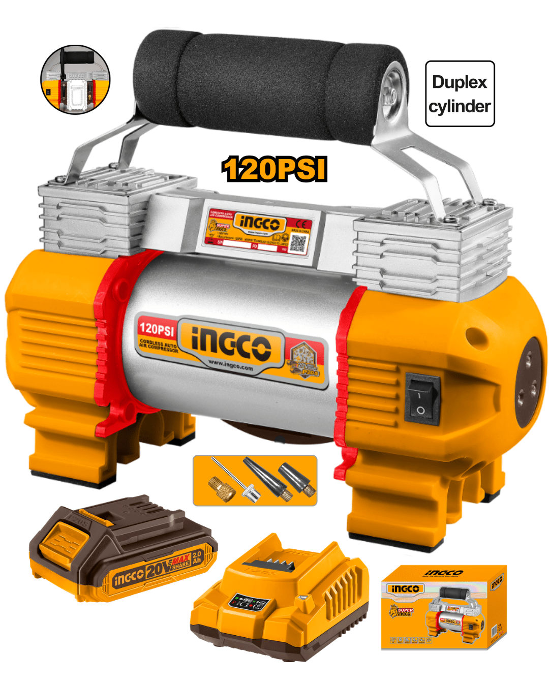 Compresor de aire inalámbrico diseñado para inflado rápido y práctico en neumáticos, bicicletas, balones y otros usos domésticos o de emergencia. Su sistema de 20V permite trabajar sin cables, ofreciendo portabilidad y comodidad en cualquier entorno. Cuenta con cilindro dúplex que mejora el rendimiento y velocidad de inflado, además de luz LED integrada para facilitar el uso en condiciones de baja visibilidad.