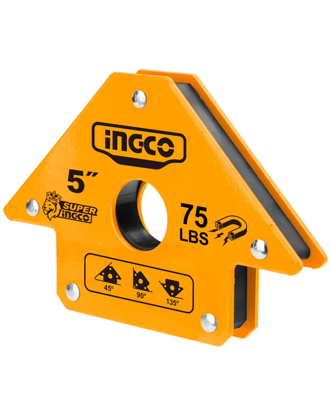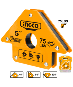 Herramienta esencial para trabajos de soldadura, diseñada para mantener piezas metálicas en su lugar. Tiene una fuerza de sujeción de 75 libras (34 kg) y permite asegurar piezas en ángulos de 45°, 90° y 135°. Fabricada con imán y acero, su tamaño es de 125 mm, proporcionando estabilidad y precisión en los proyectos de soldadura.