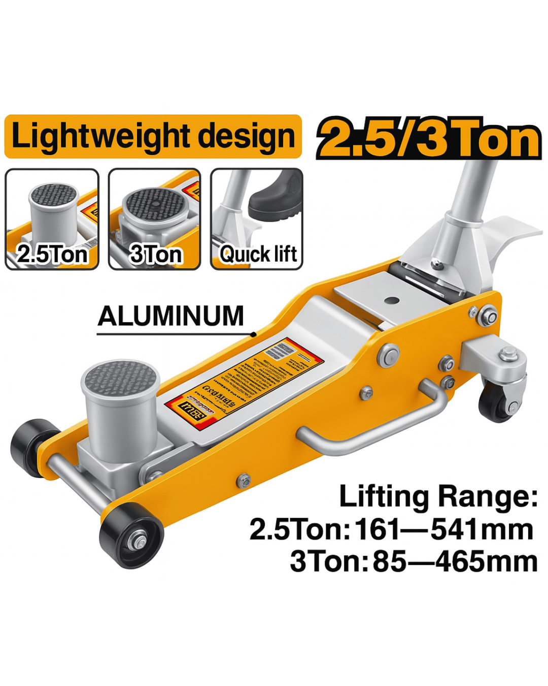 Gato hidráulico profesional de perfil bajo con diseño ligero de aluminio, ideal para talleres mecánicos, vulcanizaciones y uso automotriz intensivo. Este modelo combina alta capacidad de carga con una estructura compacta, ruedas giratorias, y función de elevación rápida. Incluye dos rangos de capacidad (2.5 ton y 3 ton) para máxima versatilidad, con altura mínima de 85 mm y máxima de 541 mm. Fabricado con materiales resistentes que aseguran larga vida útil y excelente maniobrabilidad.