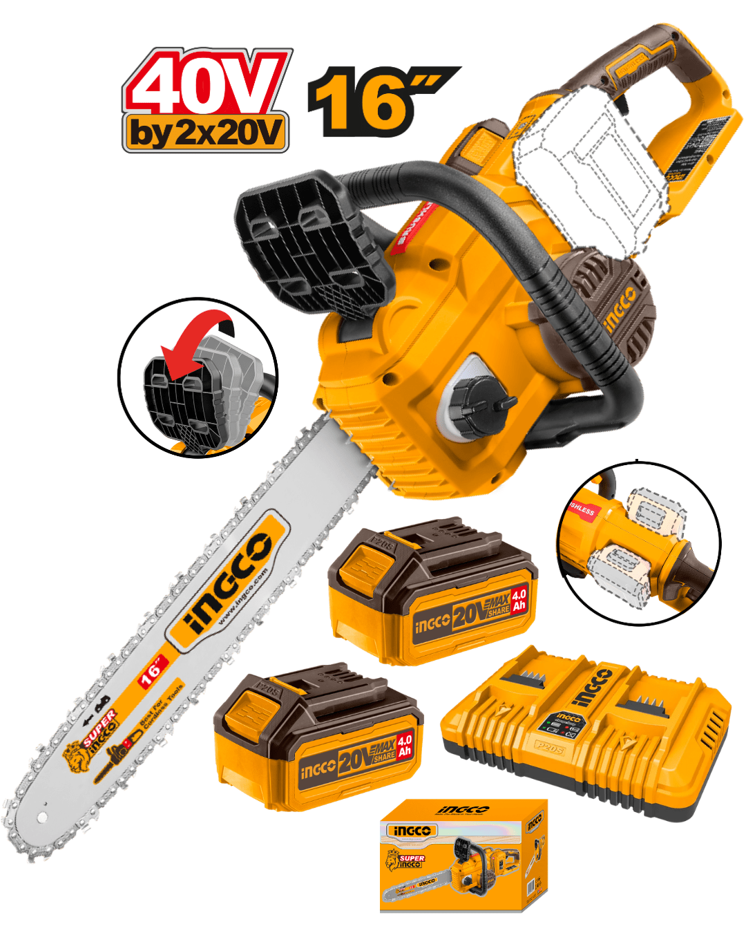 Herramienta industrial de alto rendimiento diseñada para trabajos de corte exigentes. Con un motor brushless que garantiza una mayor vida útil y un mantenimiento reducido, esta motosierra ofrece una potencia de 40V (2x20V) y una velocidad de corte de 14.5 m/s, ideal para cortes rápidos y eficientes. Su espada de 16 pulgadas (400 mm) permite una mayor precisión y capacidad de corte. Además, incluye dos baterías de 4AH y un cargador doble, lo que asegura un uso prolongado sin interrupciones. También cuenta con un tanque de aceite de 170 ml para un funcionamiento continuo. Esta herramienta es perfecta para uso en exteriores, gracias a su portabilidad y facilidad de uso.