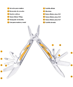 Herramienta versátil y compacta, ideal para actividades al aire libre, bricolaje y tareas cotidianas. Fabricada con componentes de acero inoxidable y un mango con agarre de goma suave, ofrece durabilidad y comodidad. Su diseño plegable permite un fácil transporte, y viene acompañada de una funda de nailon para el cinturón. Con un tamaño cerrado de 100 mm y abierto de 155 mm, integra 15 funciones esenciales, convirtiéndola en una herramienta indispensable para diversas situaciones.