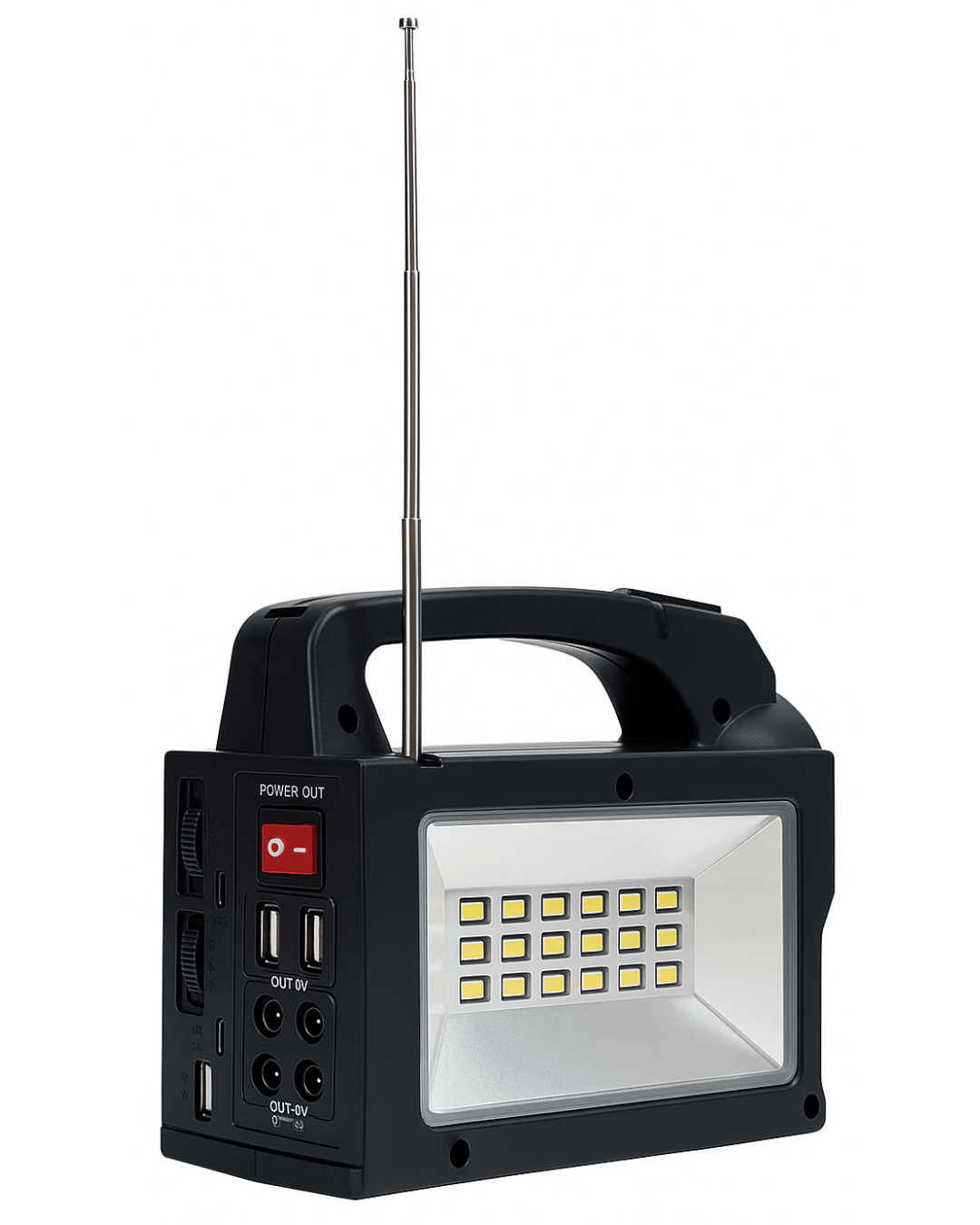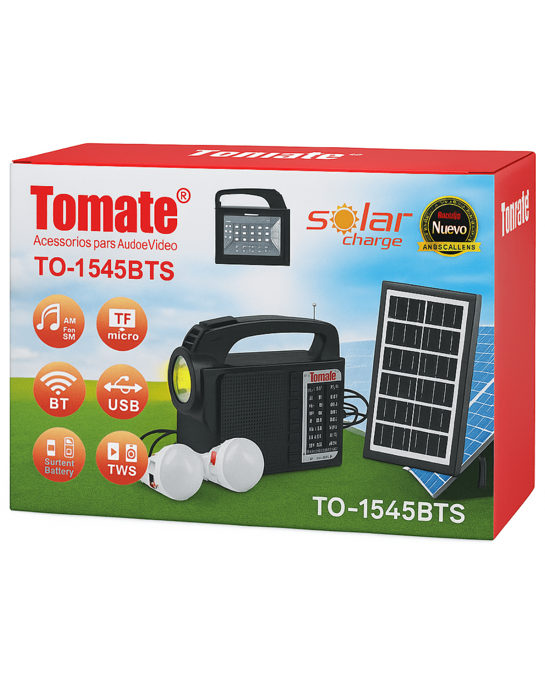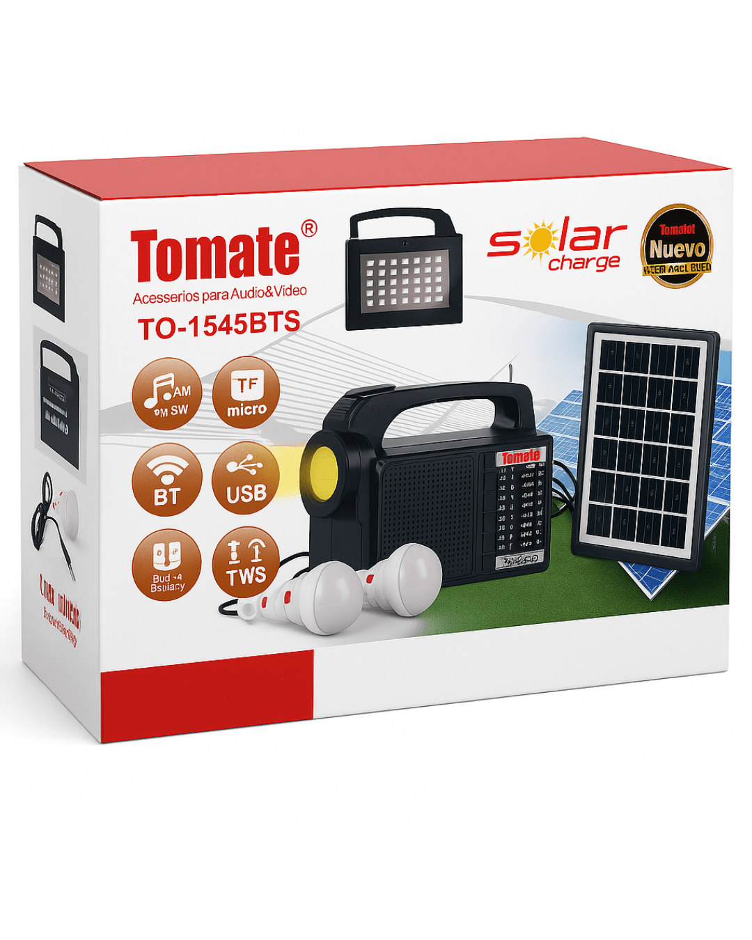 Radio solar multifuncional ideal para emergencias, camping o uso doméstico. Este modelo combina radio AM/FM/SW de 3 bandas, linterna LED frontal, panel solar para recarga y salidas USB para cargar dispositivos. Además, incluye dos ampolletas LED para iluminación adicional, lo que lo convierte en una solución completa y portátil. También cuenta con Bluetooth, entrada USB, ranura para tarjeta TF/microSD, batería recargable incorporada y función TWS para sincronizar con otro altavoz compatible.