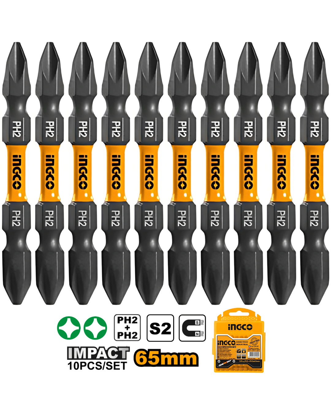 Juego de puntas PH2 dobles de 65 mm diseñadas especialmente para atornilladores de impacto. Fabricadas en acero industrial S2 con acabado negro e imantadas, estas puntas ofrecen mayor precisión, durabilidad y resistencia en trabajos exigentes. Su diseño con zona de absorción de impactos («shock zone») reduce el riesgo de quiebres, mientras que la funda de alta visibilidad facilita su uso en cualquier entorno. El set incluye 10 unidades idénticas, presentadas en una caja plástica organizadora.