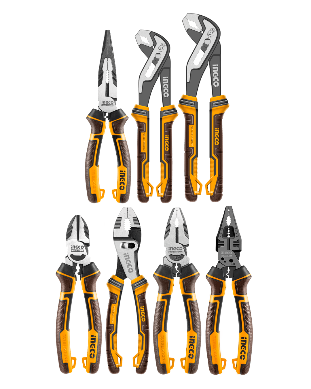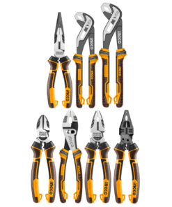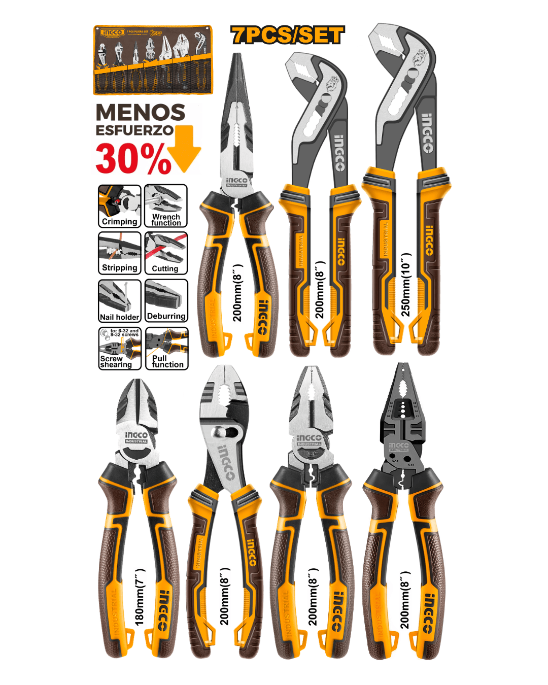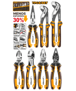 Set profesional de 7 alicates diseñado para trabajos exigentes de sujeción, corte, ajuste y manipulación en mecánica, electricidad e instalación. Este conjunto combina alicates de alta palanca con ahorro de esfuerzo de hasta 30% junto a un alicate multifunción 8 en 1, permitiendo cubrir múltiples aplicaciones con máxima eficiencia. Fabricados en acero Cr-V con acabado pulido y tratamiento anticorrosivo, incorporan mangos ergonómicos TPR antideslizantes para un agarre firme, cómodo y seguro en uso intensivo.