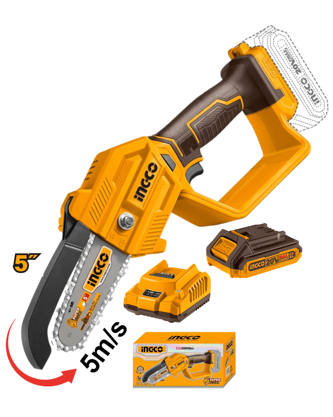 Herramienta compacta y potente, diseñada para trabajos de poda y corte ligeros. Alimentada por una batería de 20V (incluida), proporciona la libertad de movimiento necesaria para trabajar en áreas sin acceso a la red eléctrica. Su barra de 5 pulgadas permite cortes precisos en ramas y pequeñas piezas de madera. La motosierra cuenta con un diseño ergonómico que facilita su manejo y reduce la fatiga del usuario. Ideal para jardinería y mantenimiento de exteriores, combina eficiencia y comodidad en un solo dispositivo.