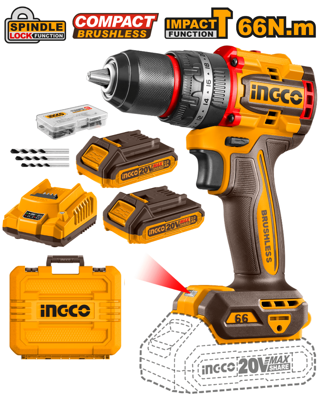 Herramienta profesional diseñada para ofrecer alto rendimiento y versatilidad en tareas de perforación, atornillado y perforación con percusión. Equipado con un motor sin escobillas (brushless), proporciona mayor eficiencia y durabilidad. Su diseño compacto y ergonómico, junto con características como luz LED integrada y engranaje mecánico de 2 velocidades, lo hacen ideal para trabajos en diversos materiales.